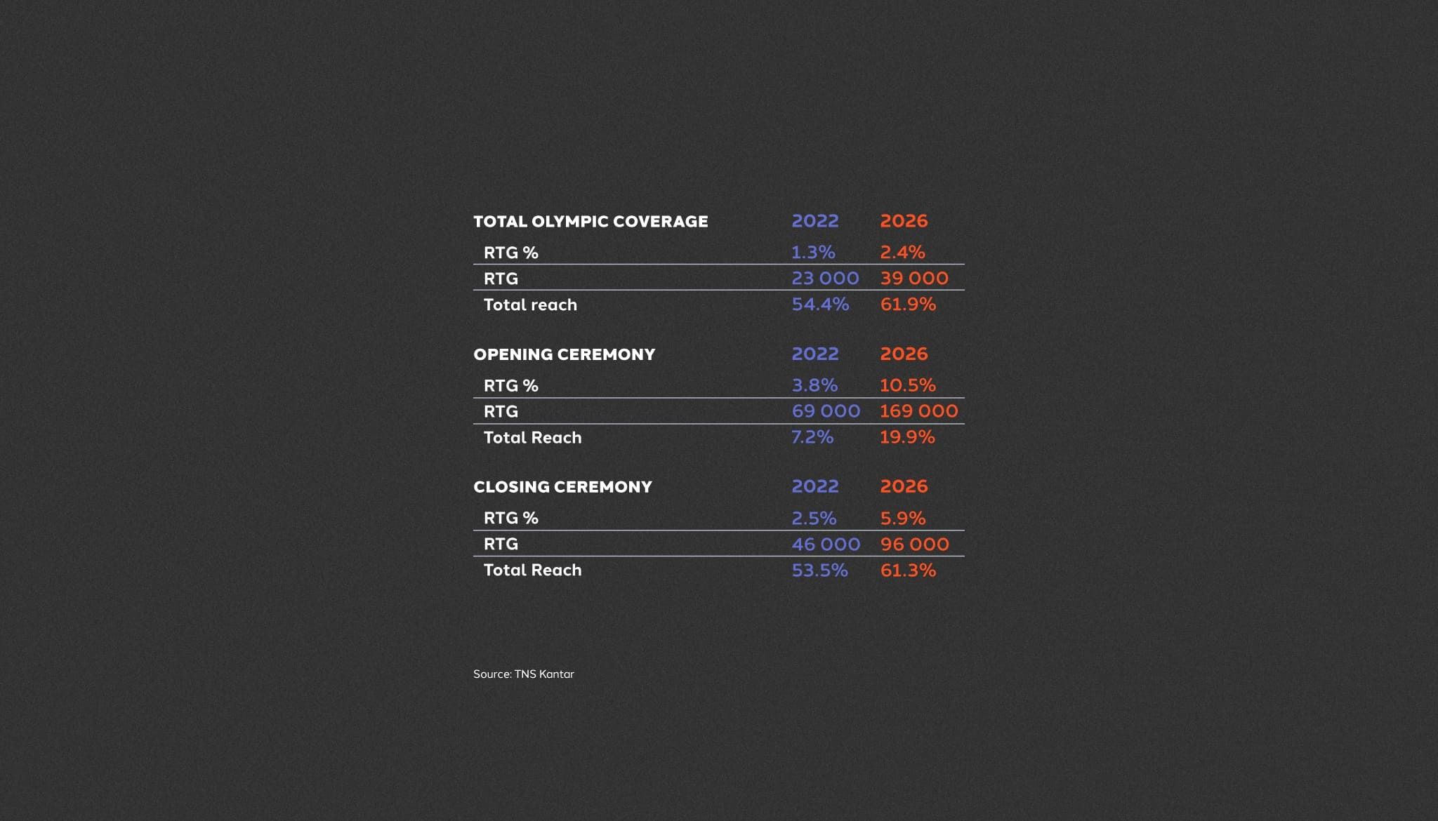 In 2022, the Games were watched on average by 1.3% of TV households, equivalent to approximately 23,000 viewers. The total reach was 54.7%, indicating that more than half of all TV viewers tuned in to an Olympic broadcast at least once. In 2026, average viewership reached 2.4%, or around 39,000 viewers, with a total reach of 61.9%, meaning nearly three out of five TV viewers watched at least part of the Games.