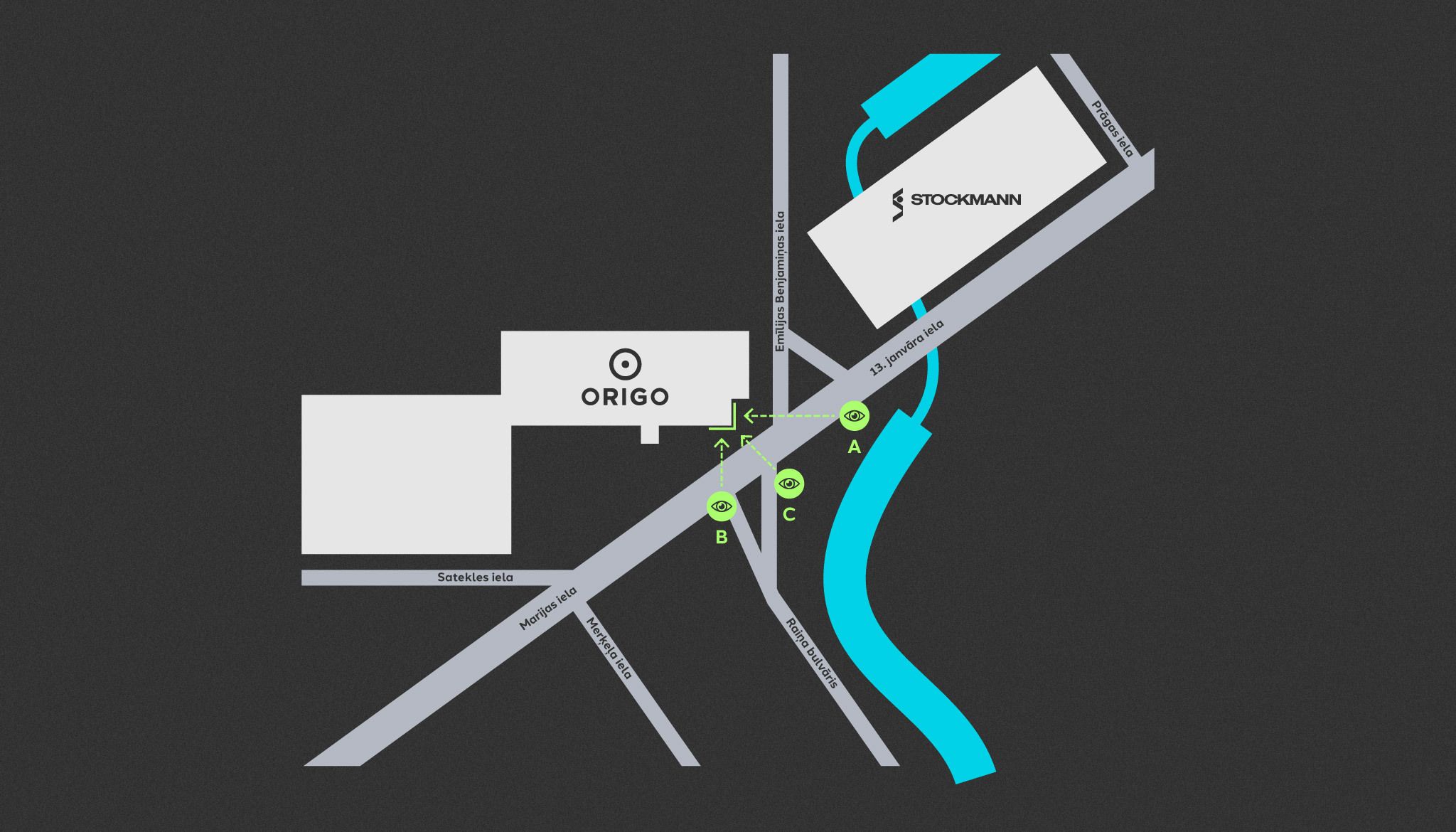 A skatu punkts – plūsma, kas pārvietosies virzienā no 13. janvāra ielas uz Origo. B skatu punkts – plūsma, kas dosies no Marijas un Satekles ielas virzienā uz Origo. C skatu punkts – 3D video efekts! Plūsma, kas no Raiņa bulvāra puses tuvosies krustojumam, redzēs abas ekrāna puses reizē. Tādējādi ļaujot ieraudzīt 3D efektu!